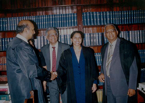New Attorney-at-Law Ms Trishala Persaud is congratulated by Chief Justice Mr. Carl Singh in the presence of her father, Mr. Reepu Daman Persaud (second from left) and Attorney General Mr. Doodnauth Singh, S.C.