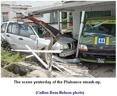 crash A smash-up at Plaisance, East Coast Demerara, early yesterday morning, mangled three vehicles, cut down a utility pole, damaged two fences and shifted a guard hut.